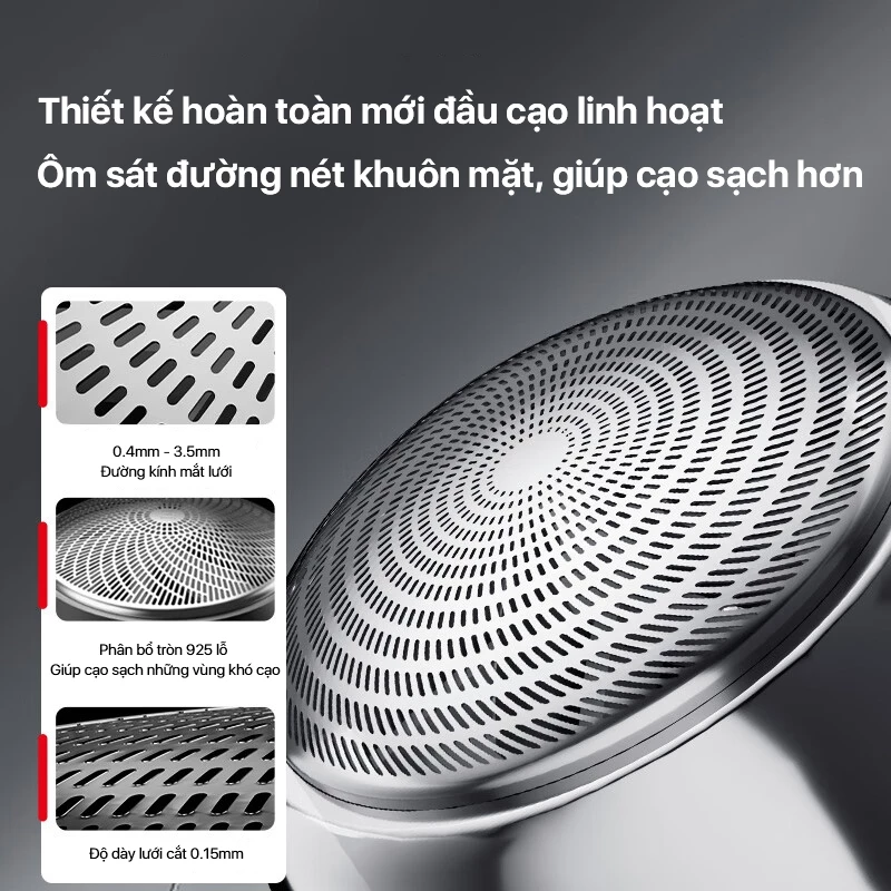 – Đầu dao thiết kế dạng lưới với 925 lỗ dao động từ 0,4-3,5mm hạn chế tối đa góc chết khi cạo râu. Đồng thời đầu dao được thiết kế cong nhẹ dễ dàng sử dụng trên mặt