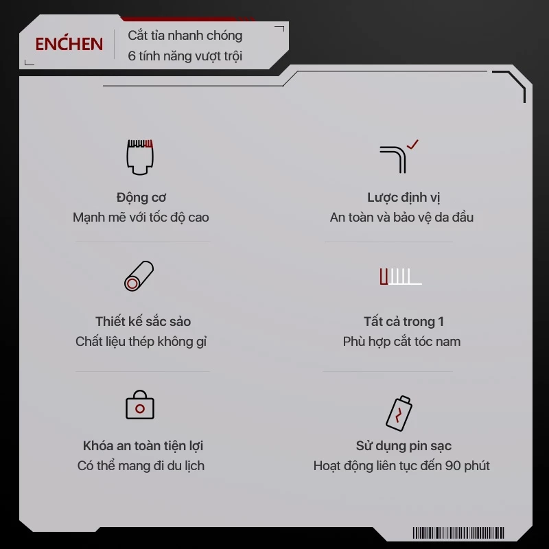 – Độ ồn thấp: tông đơ Enchen vận hành êm ái với độ ồn chỉ khoảng 65dB