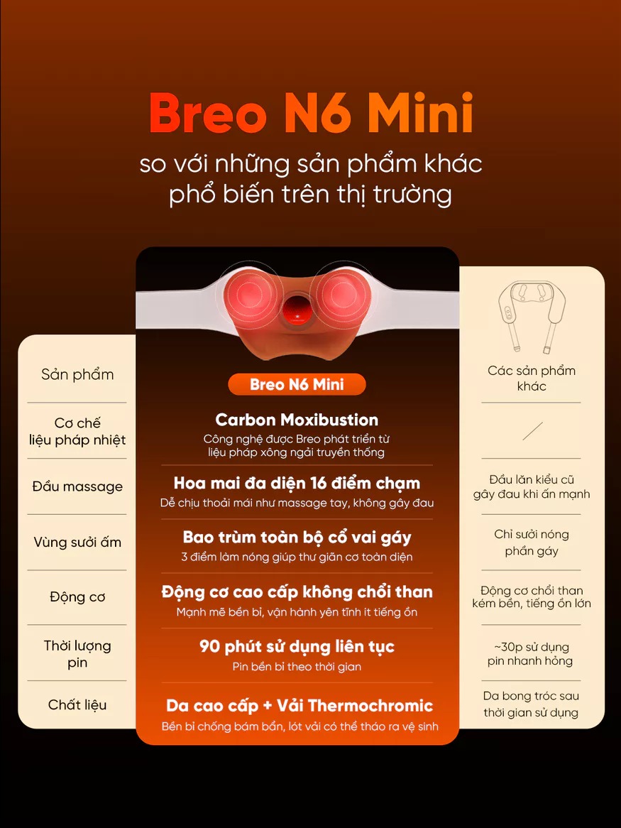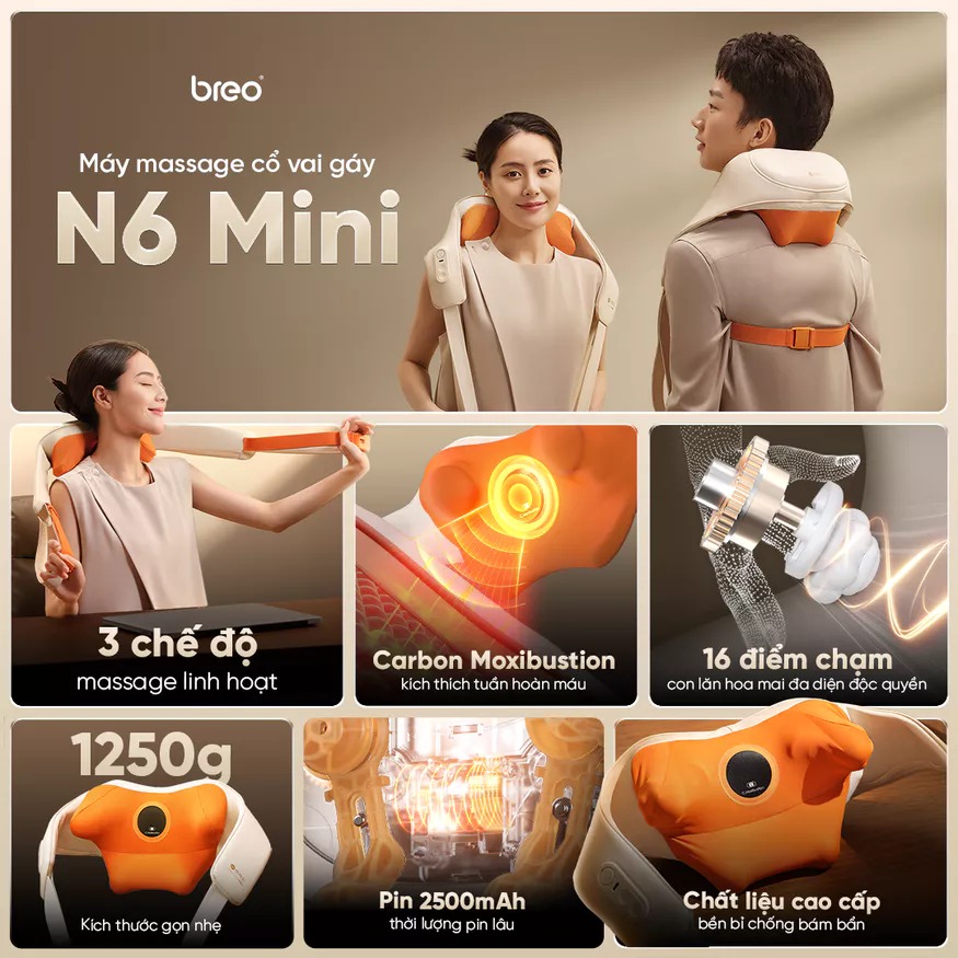 BREO N6 MINI tích hợp 3 chế độ massage linh hoạt, chức năng xông nóng bằng carbon hồng ngoại lên đến 40-45°C, và công nghệ tiên tiến giúp giảm căng cơ, kích thích tuần hoàn máu. Với pin 2500mAh sử dụng lâu dài, chất liệu cao cấp thân thiện với da, và thiết kế nhỏ gọn, sản phẩm mang đến trải nghiệm massage yên tĩnh, tiện lợi cho mọi nhu cầu thư giãn dù ở nhà hay khi di chuyển.
