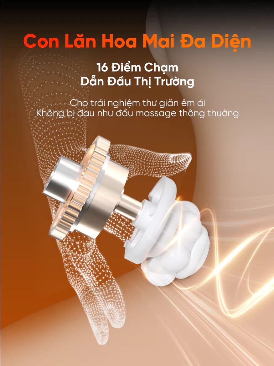 – Thiết kế con lăn hoa mai đa diện, mô phỏng kỹ thuật xoa bóp cổ truyền với 16 điểm tiếp xúc