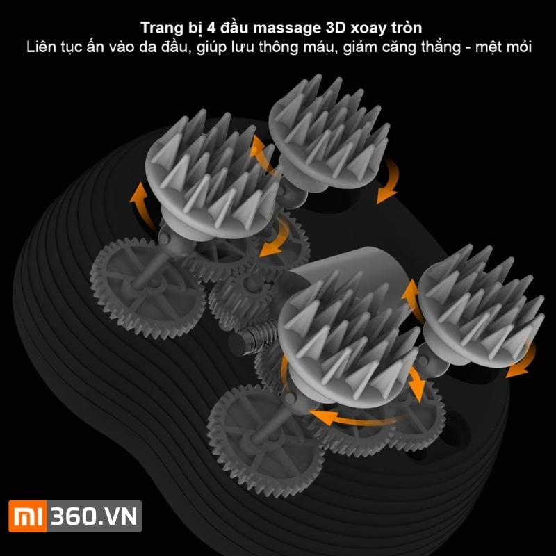 Thiết kế 4 đầu massage 3D với tổng cộng 84 điểm tiếp xúc, chạm sâu vào phần da đầu. 4 vòng xoay tròn mô phỏng chuyển động tương tự như cách massage truyền thống bằng tay của thợ chuyên nghiệp, liên tục ấn vào da đầu, giúp lưu thông máu, giải phóng áp lực, cho bạn thoải mái tận hưởng phút giây thư giãn cực kì sảng khoái.