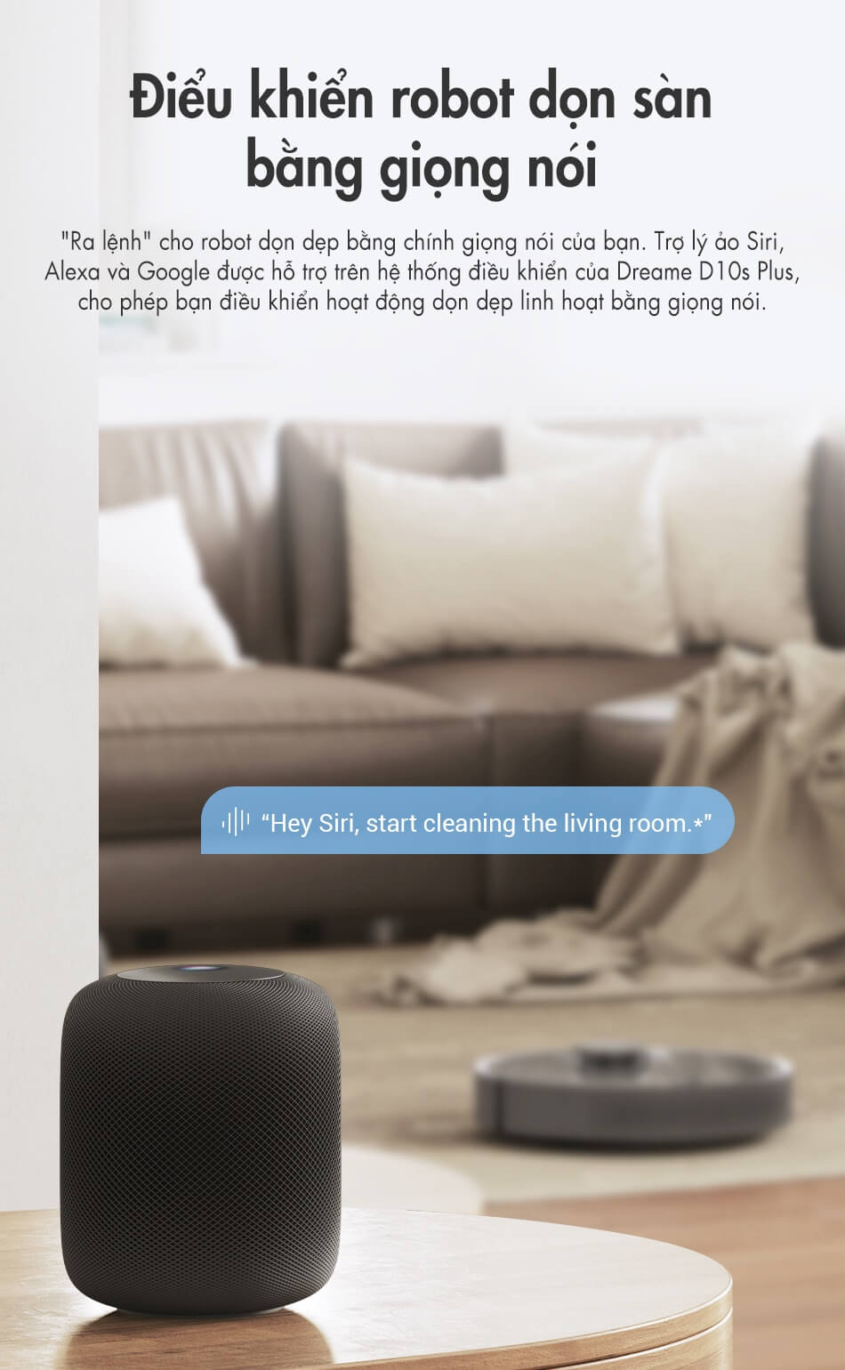 Ngoài việc kết nối app thông minh, Dreame D10S Plus còn tích hợp ra lệnh bằng giọng nói qua các trợ lí ảo: Hey Siri, Google Assistant, Amazon Alexa.