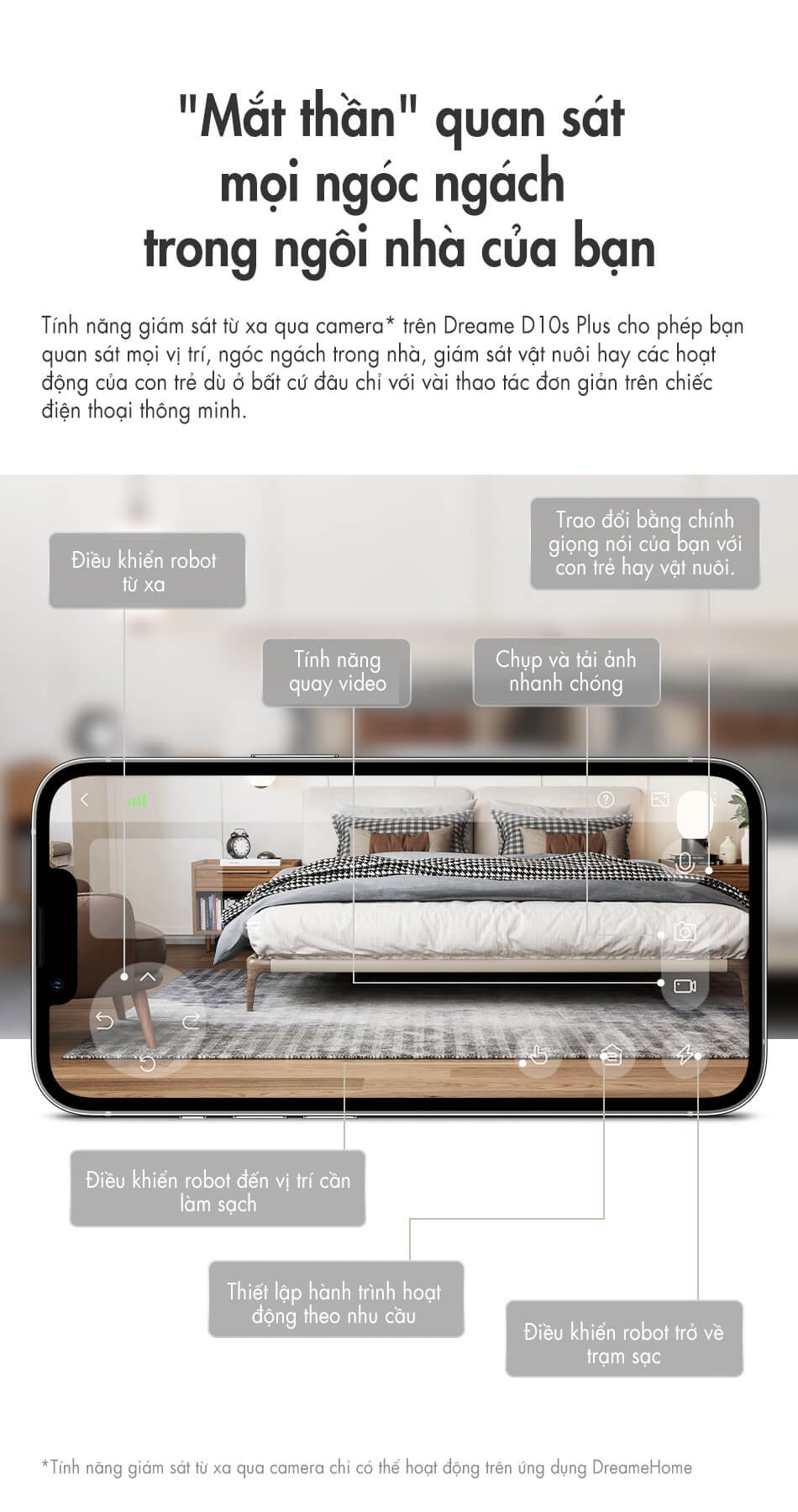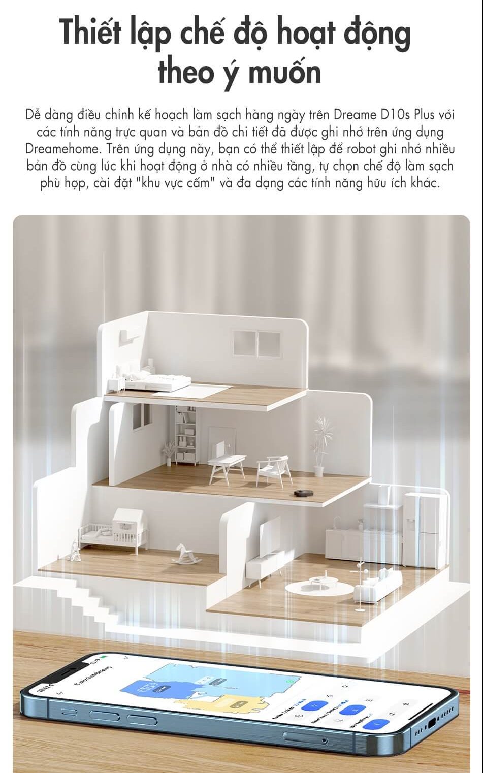 Bằng việc kết nối thông qua kết nối App Dreame Home, giúp người dung có thể dễ dàng thao tác theo nhu cầu như lưu thông tin được tối đa 3 tầng bản đồ; tạo vùng cấm, tường ảo, hẹn giờ, điều chỉnh lực hút…