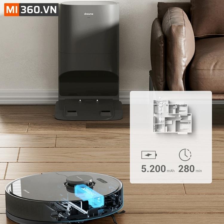 Robot hút bụi lau nhà Dreame D10S Plus được trang bị pin 5200mAh cho phép hoạt động lên đến 280 phút hoạt động ở chế độ tiêu chuẩn. Bên cạnh đó, robot sẽ chủ động quay về dock sạc khi gần hết pin và sẽ làm việc tiếp theo khi nạp pin đầy.
