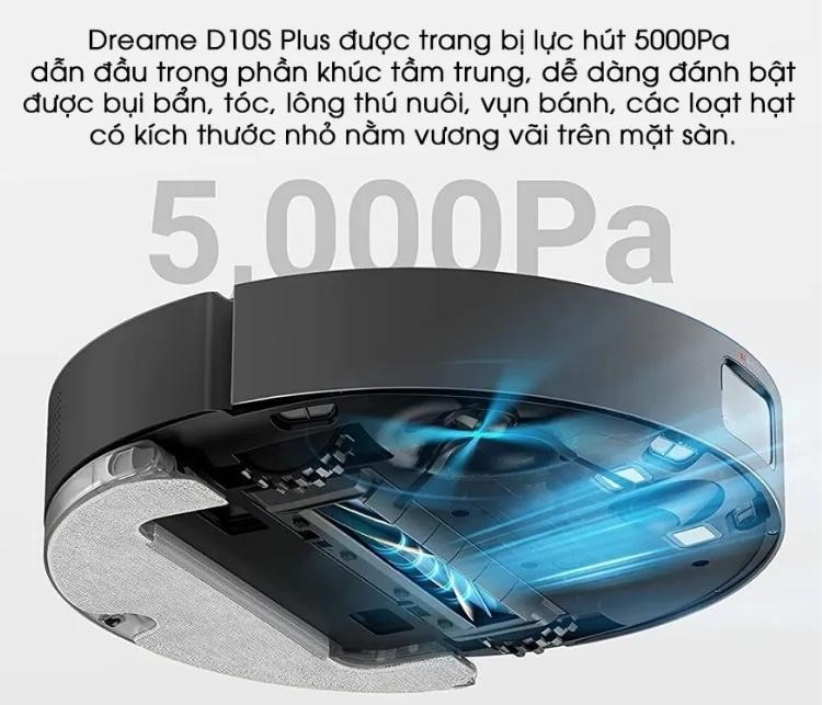 Robot hút bụi lau nhà Dreame D10S Plus sở hữu lực hút mạnh mẽ lên đến 5.000Pa (mạnh mẽ hơn so với D10 Plus). Từ đó, giúp Robot đánh bật mọi vết bẩn, long, tóc… cứng đầu giúp sàn nhà bạn luôn trong trạng thái sạch sẽ.