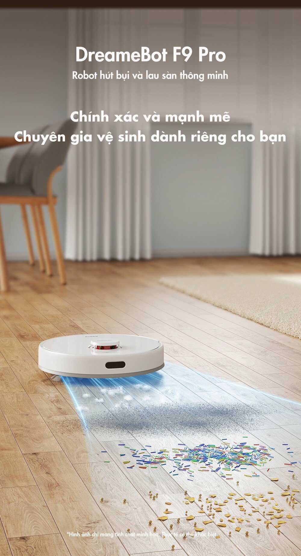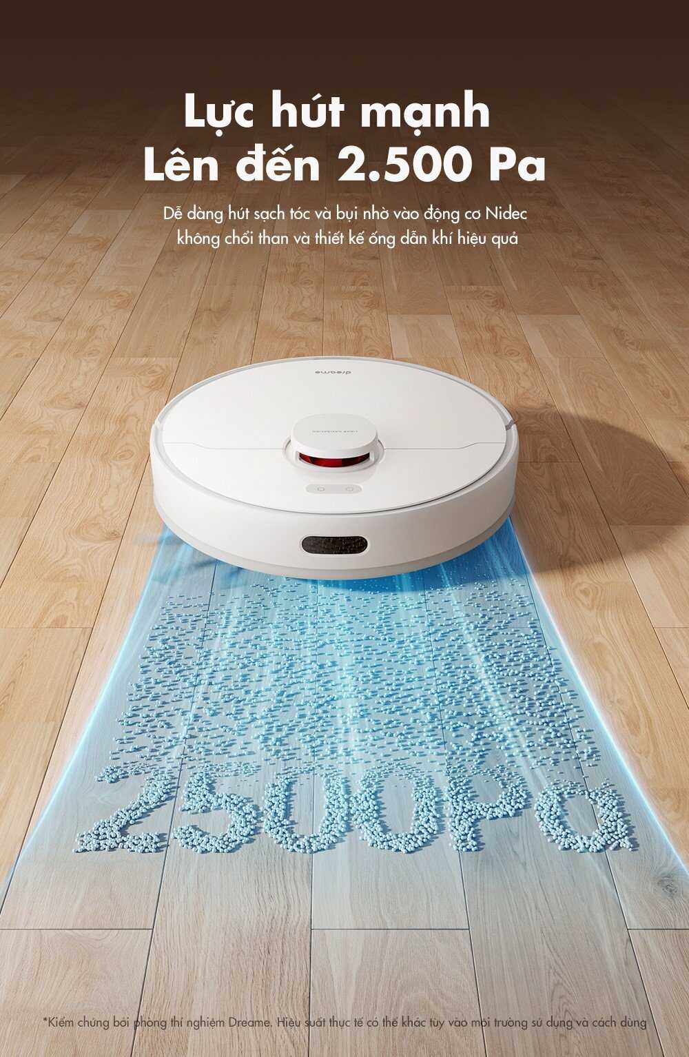 Dreame F9 Pro sở hữu lực hút 2500Pa đáp ứng việc làm sạch bụi mịn trên mặt sàn, các mảnh vụn, các dạng hạt có kích thước vừa và nhỏ.