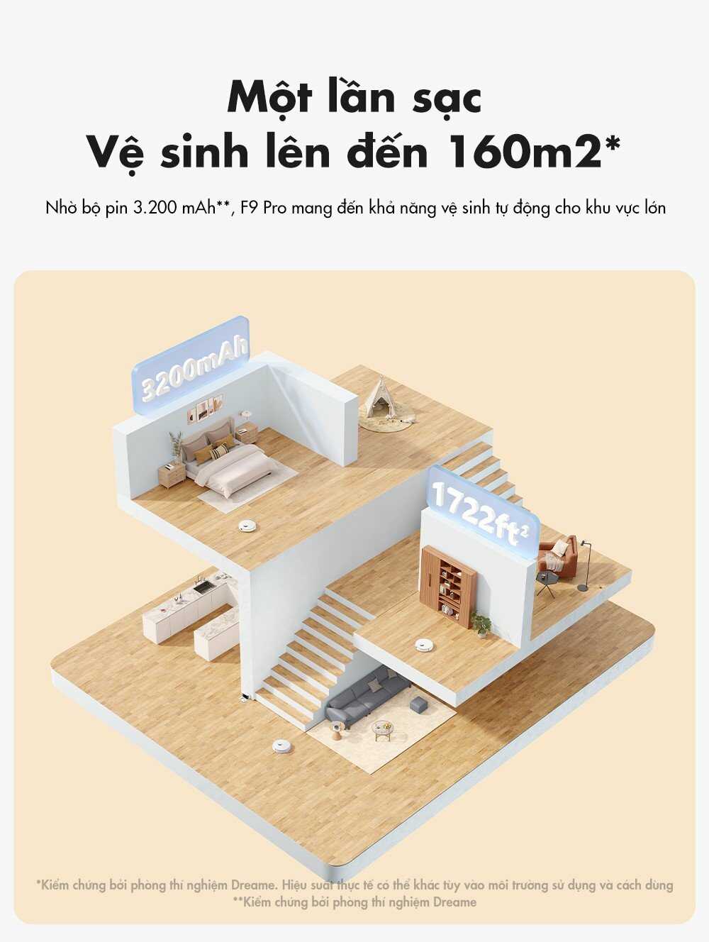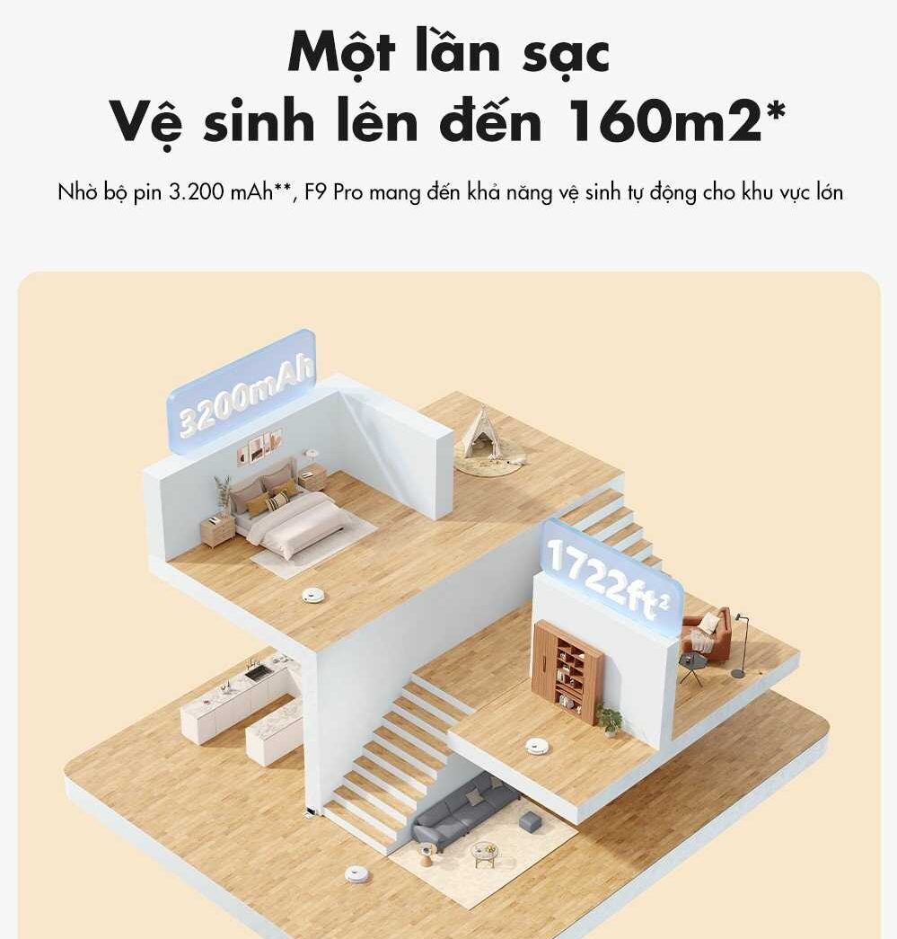 Dreame F9 Pro được nhà sản xuất trang bị viên pin 3200mAh tối ưu cho 150 phút vận hành ở chế độ tiêu chuẩn, khi gần hết pin thì robot cũng sẽ tự động quay trở về dock sạc để sạc đầy pin và sau khi được nạp đầy pin sẽ tiếp tục phần công việc còn gian dở.