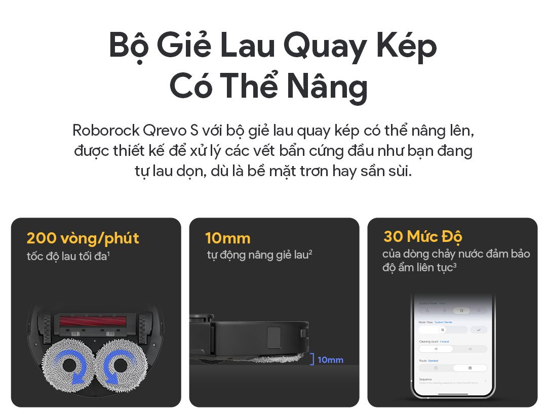 Nhờ khả năng lau xoay kép 360 độ cùng tốc độ xoay ấn tượng lên đến 200 vòng/phút, Roborock Q Revo S sẽ làm cho mọi vết bẩn trên sàn nhà bị loại bỏ một cách nhanh chóng. Đặc biệt cây lau nhà kép có thể nâng lên, Roborock Qrevo S được thiết kế để xử lý các vết bẩn cứng đầu như thể bạn đang tự lau nhà, cho dù đó là sàn nhẵn hay bề mặt gồ ghề.